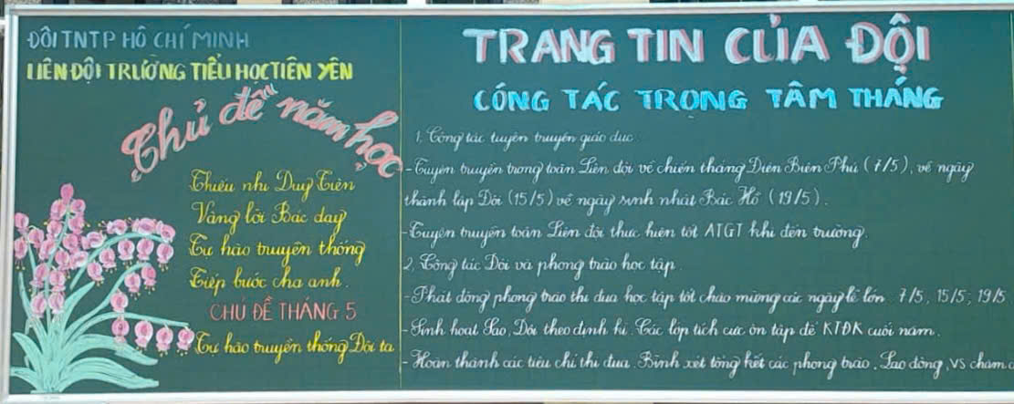 Phần công trình măng non và bảng tin tuyên truyền: Liên đội có công trình măng non đã phân hóa theo cấp Liên đội và cấp chi đội được các em chăm sóc thường xuyên. Bảng tin và trang tin của Đội được cập nhật theo từng tháng cụ thể để tuyên truyền cho các em đội viên và nhi đồng hiểu rõ các ngày lễ lớn trong tháng.